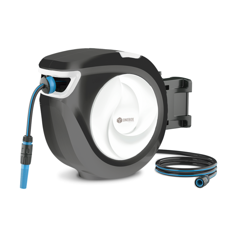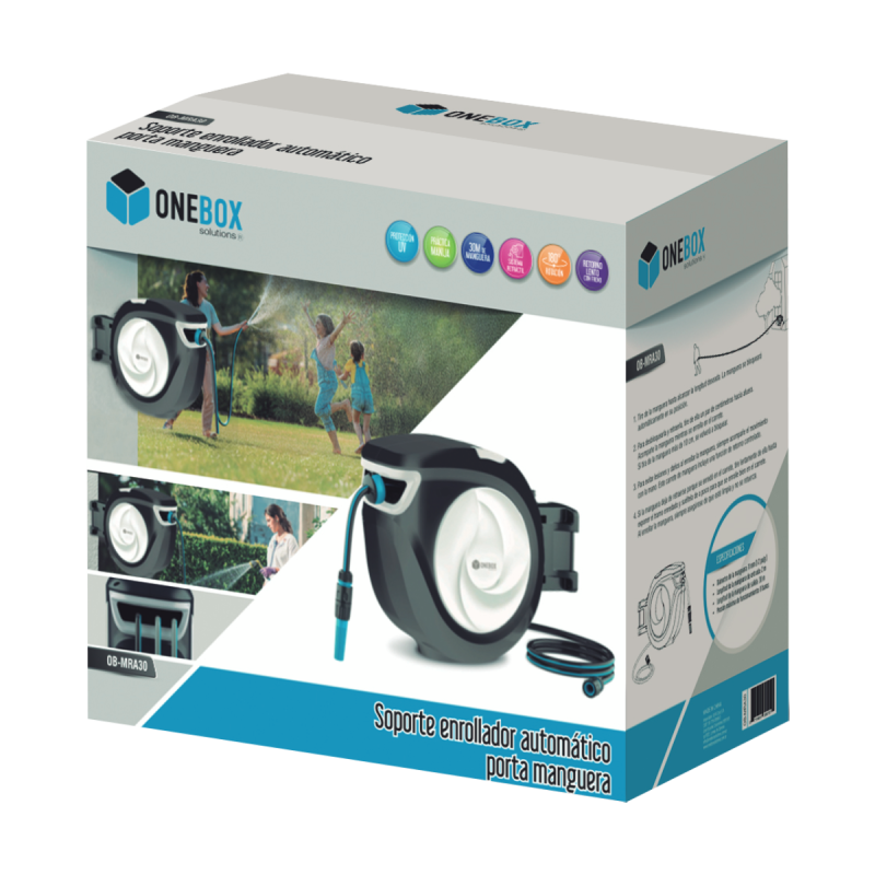 Ideal para un uso práctico y duradero. Cuenta con sistema de enrollado automático, soporte giratorio y manguera de 30 metros lista para trabajar bajo presión.